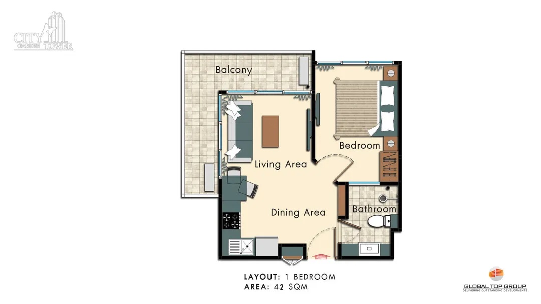 Lägenheterna i City Garden Tower finns i olika storlekar och planlösningar. Denna möblerade condo är på 42 kvm och har vardagsrum och kök i öppen planlösning, sovrum, badrum med wc samt en vidsträckt balkong med utsikt över staden och havet. Obs condon säljs möblerad!