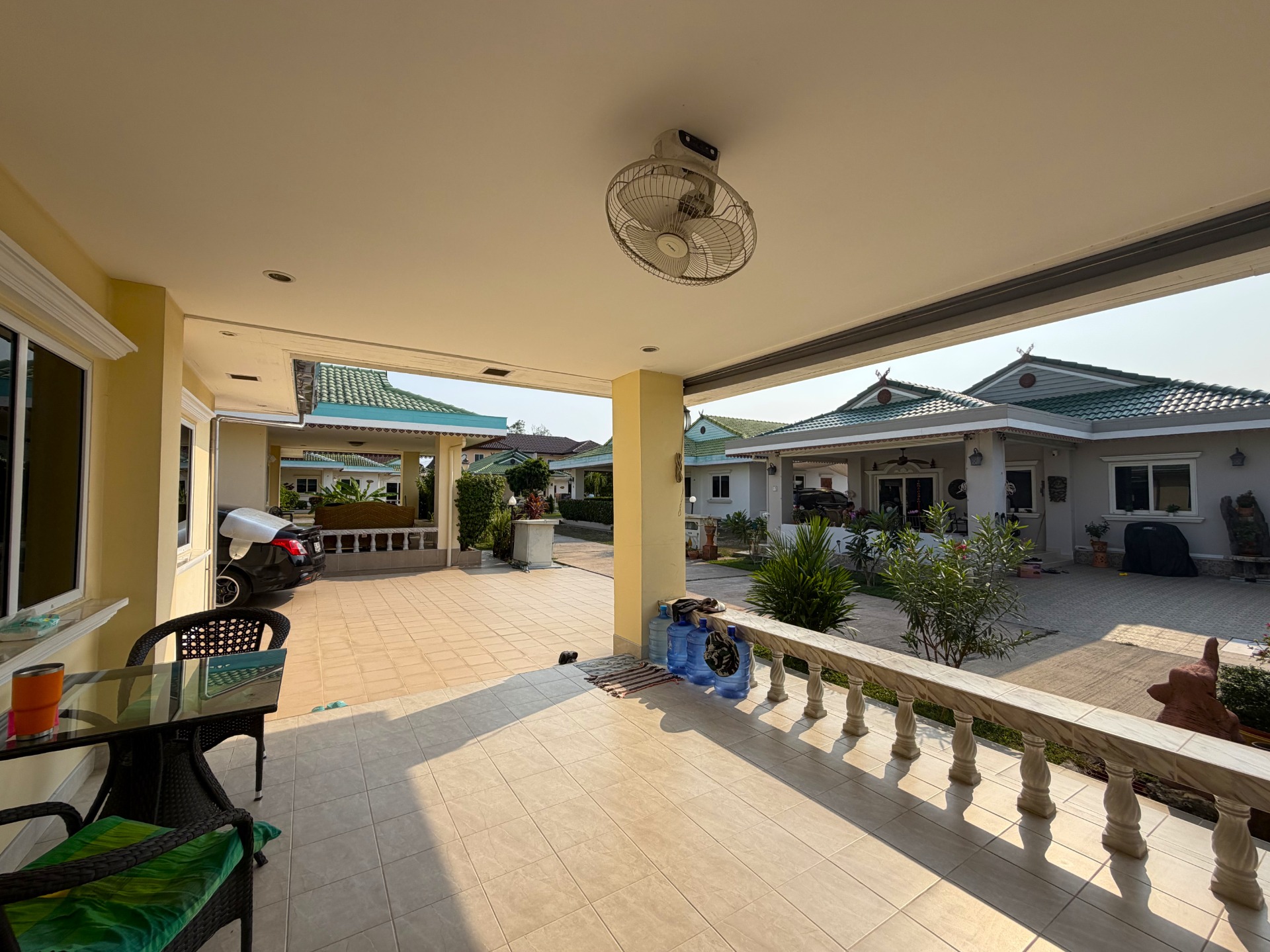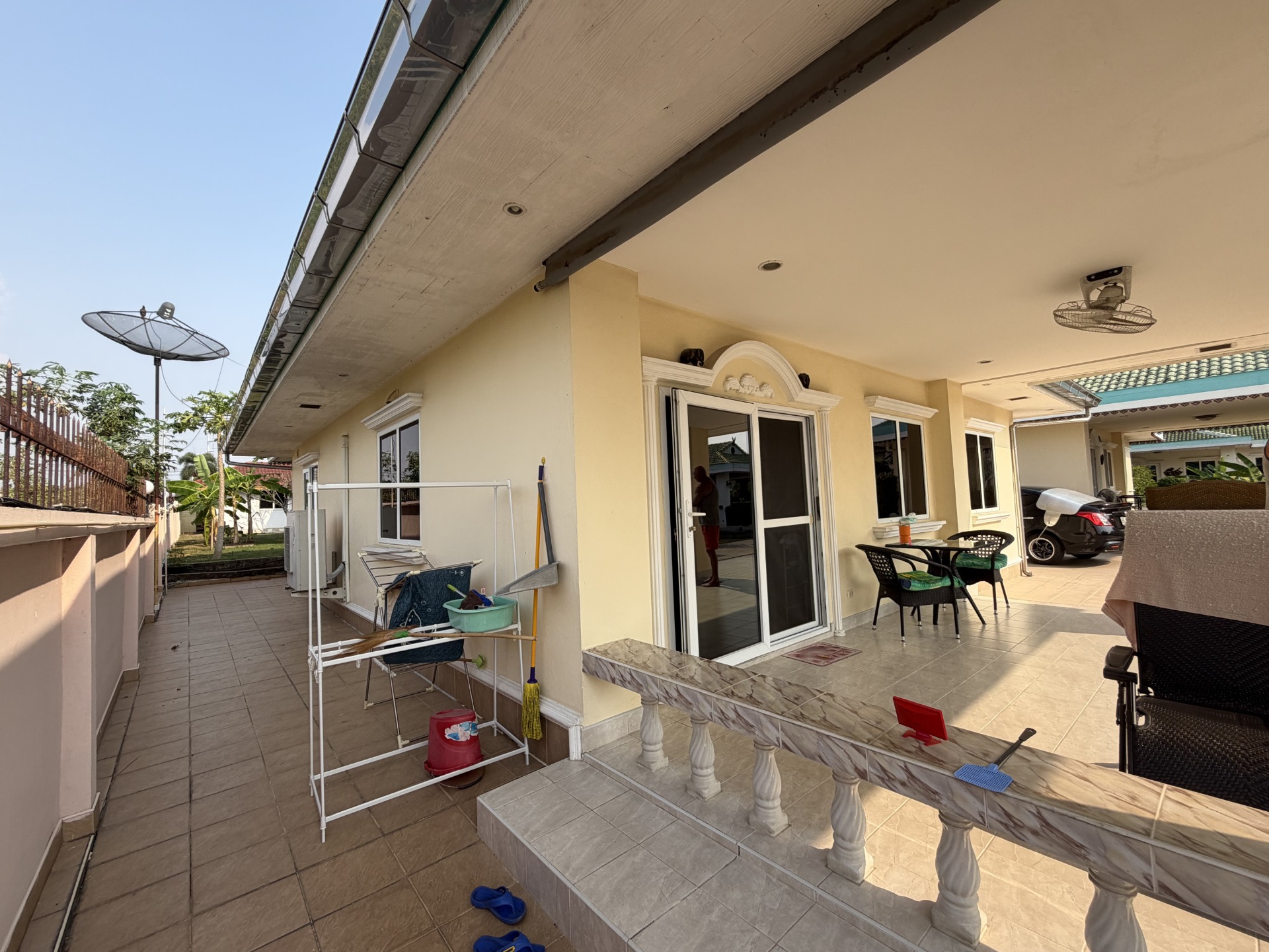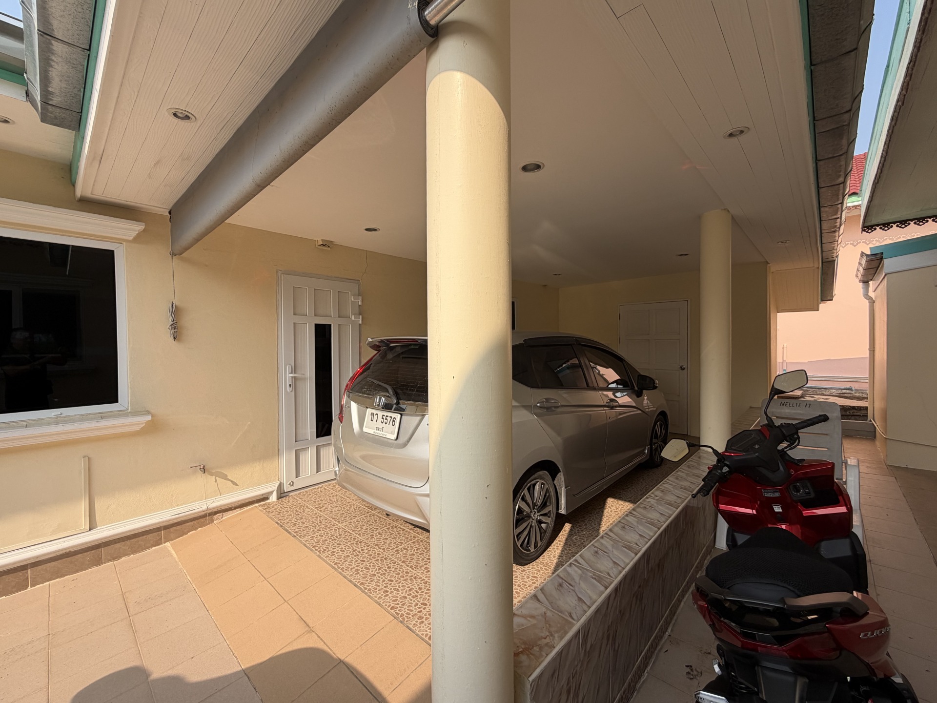 Välkommen till Sabai Village och till denna lyxiga hörn bungalow med carport, förråd och stor terrass under tak. Bungalowen har en stor hörntomt med buskar, träd och blommor och ligger inte långt ifrån områdets stora pool. På uppfarten vid huset har man även sin egna parkeringsplats under den tillbyggda carporten. På gatan några få meter bort finns både flera thai restauranger, shopping butiker, motorcykel verkstad och 7-Eleven. Här är det lugnt och tyst på grund av områdets höga mur som sträcker sig runt hela området. Luftigt vardagsrum med kök i öppen planlösning med full maskinpark, två luftiga sovrum, samt ett helkaklat badrum med dusch, handfat och wc. Alla rummen är fullt möblerade med soffgrupp, köksmöbler, utemöbler, bestick och glas, takfläktar och AC etc etc. Området har en stor gemensam pool om 900 kvm med barnpool, bubbelpool samt dusch och wc. Hela området består av endast 37 bungalow och är öppet och luftigt utan mur runt husen med gröna gräsmattor, blommor, buskar, fruktträd och palmer. Här finns trädgårdsmästare, poolskötare, bevakning och underhålls-personal på heltidsanställning för att hålla området välskött. Sabai betyder "må bra" på thailändska vilket är ledstjärnan för hela området. Vid entrén står en vakt och bevakningen sker 24-timmar om dygnet. De flesta som bor här på området är Skandinaver.