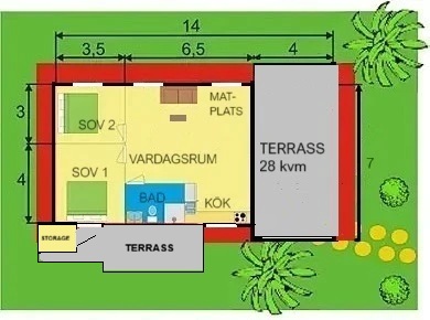 STORLEK: Ca 70 kvm boyta + terrass under tak 28 kvm + terrass 10 kvm + Förråd 4 kvm = 112 kvm